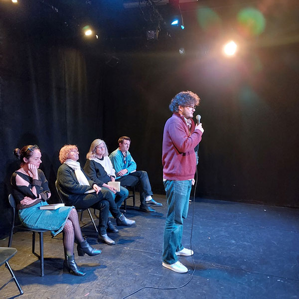 Alexandre Bonnet-Terrile sur scène, lors de la soirée de lancement de l’anthologie,