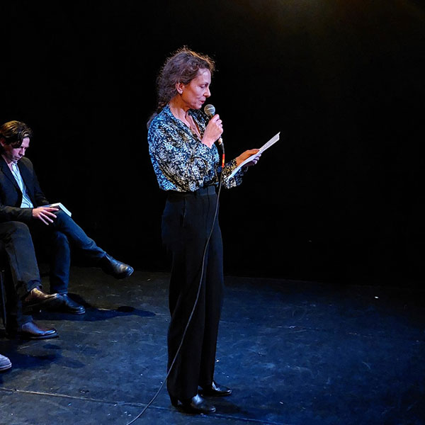 Séverine Daucourt sur scène, lors de la soirée de lancement de l’anthologie,